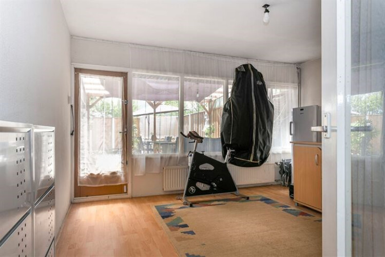 Entree/hal, meterkast, trapopgang; royale slaapkamer met vele gebruiksmogelijkheden, toegang tot de zonnige tuin; inpandige garage, opstelplaats voor de wasmachine.