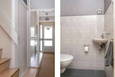 Hal met veel lichtinval dankzij de grote glazen pui naar de woonkamer en de open verbinding naar de woonkamer, toiletruimte met wandcloset en fonteintje, handige inbouwkast, nette laminaatvloer die ruimtelijk doorloopt in de woonkamer en de woonkeuken; lichte woonkamer aan de achterzijde; mooie woonkeuken met voldoende ruimte voor een grote eettafel, keuken geplaatst in een hoekopstelling en voorzien van een kookplaat, afzuigkap, oven, vaatwasser en een koelkast.